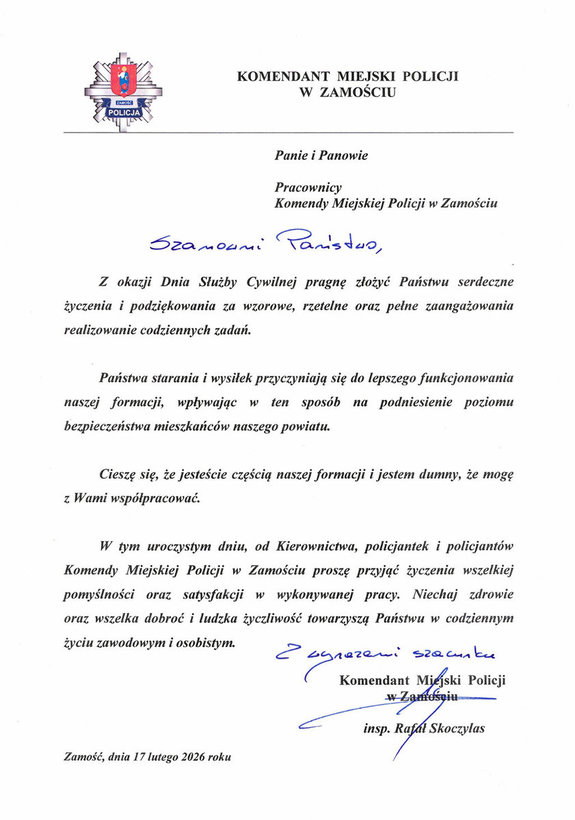 Życzenia Komendanta Miejskiego Policji w Zamościu z okazji Święta Służby Cywilnej