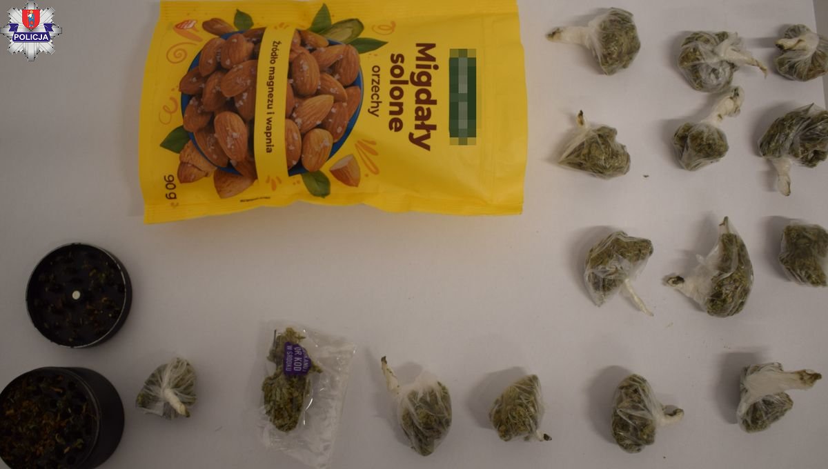 Ponad 60 porcji dilerskich marihuany posiadał przy sobie 22-latek z Zamościa. Policjanci ujawnili je w opakowaniu po migdałach. Mężczyzna w spodniach ukrywał również młynek do mielenia narkotyków. Z marihuaną wpadła również para 16-latków. Patrol zamojskich policjantów nakrył ich w ruinach budynku dawnej pieczarkarni. Znalezione przy nich narkotyki były z kolei ukryte w opakowaniu po kremie.