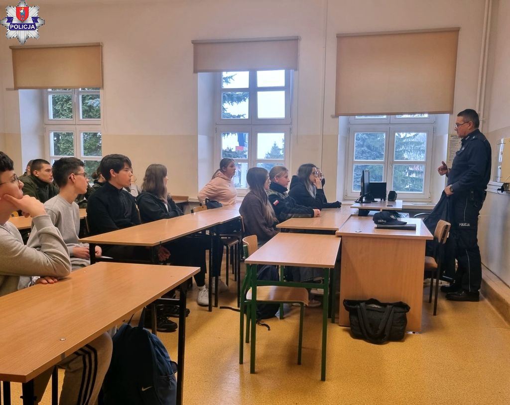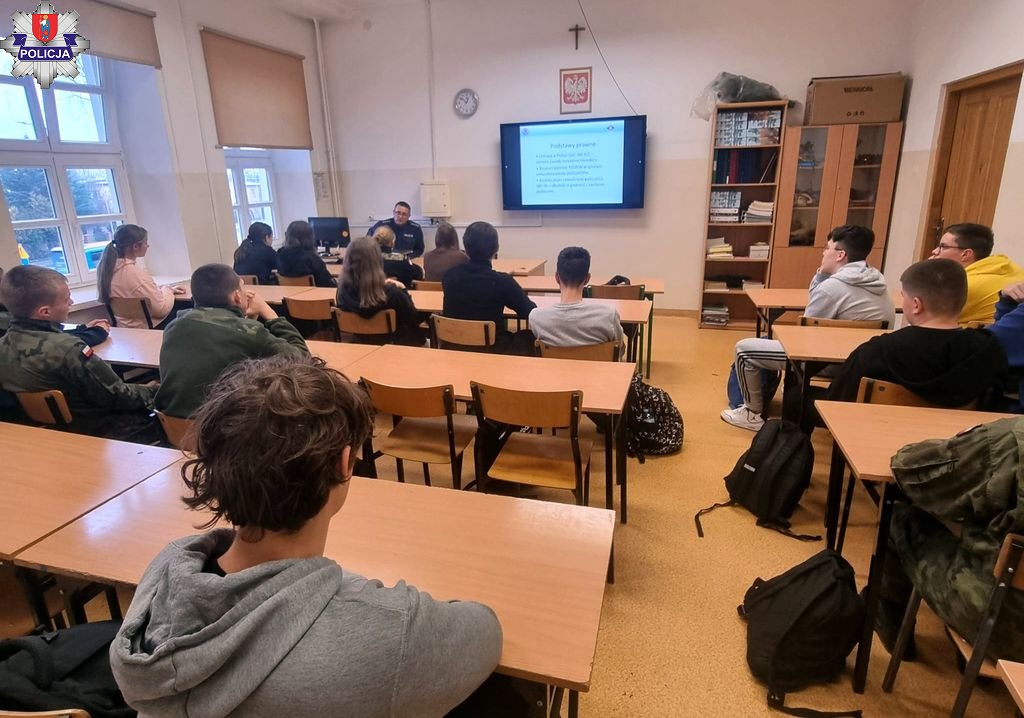Zgodnie z zaplanowanym harmonogramem — aspirant sztabowy Dariusz Kuropatnicki z Zespołu do spraw Profilaktyki Społecznej, Nieletnich i Patologii Wydziału Prewencji Komendy Miejskiej Policji w Zamościu prowadzi zajęcia dydaktyczne.