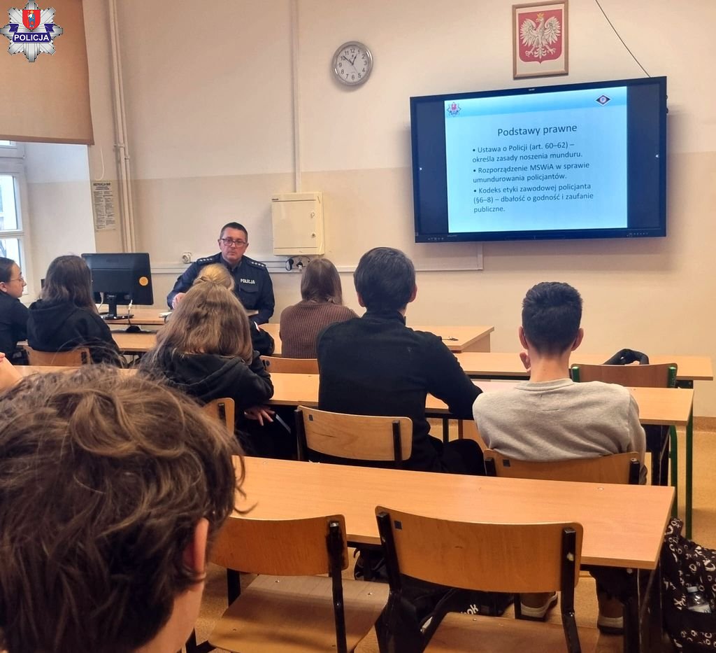 W czasie zrealizowanej w dniu 26 listopada lekcji przedstawił młodzieży specyfikę służby w naszej formacji, przybliżył uczniom charakter służby w Policji oraz pokazał stopnie i umundurowanie policyjne. Podczas zajęć uczniowie usłyszą także tematy związane z poszanowaniem munduru oraz nauczą się policyjnej musztry.