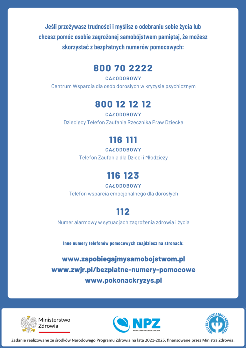 Na terenie całego kraju można dzwonić na numer alarmowy 112 lub Kryzysowy Telefon zaufania pod nr 116 123 oraz Młodzieżowy Telefon Zaufania pod nr 116 111. Pamiętajmy również, że w każdym powiecie funkcjonują instytucje, do których można zwrócić się o wsparcie w trudnych chwilach.