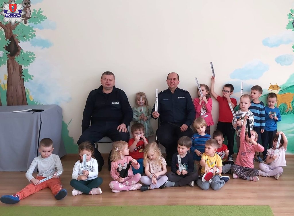 Policjanci z Krasnobrodu spotkali się z przedszkolakami w ramach ogólnopolskiej akcji „Kręci mnie bezpieczeństwo w zimie”. Podczas wizyty mundurowi rozmawiali z najmłodszymi o zasadach bezpiecznego spędzania czasu. Przekazali też wskazówki jak bezpiecznie poruszać się w pobliżu dróg. Spotkanie było okazją do nauki poprzez rozmowę i zabawę. Mali uczestnicy spotkania od policjantów otrzymali też odblaski.