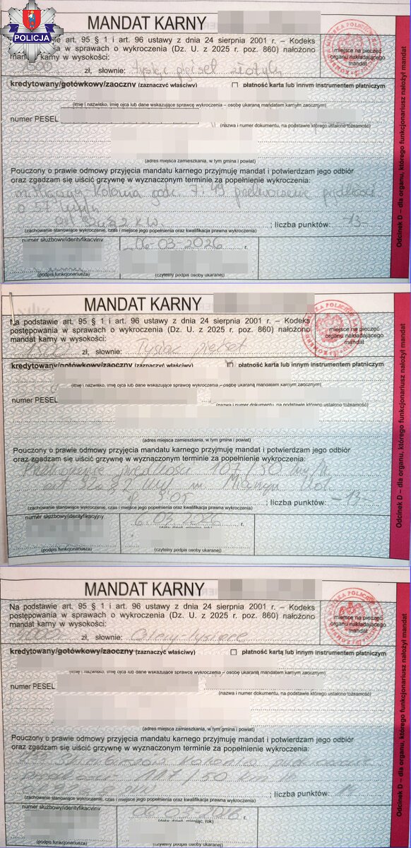 Za popełnione wykroczenia, kierujący zostali ukarani mandatami w wysokości 1500 złotych każdy i 13 punktami karnymi. Stracili też prawo jazdy na trzy miesiące.